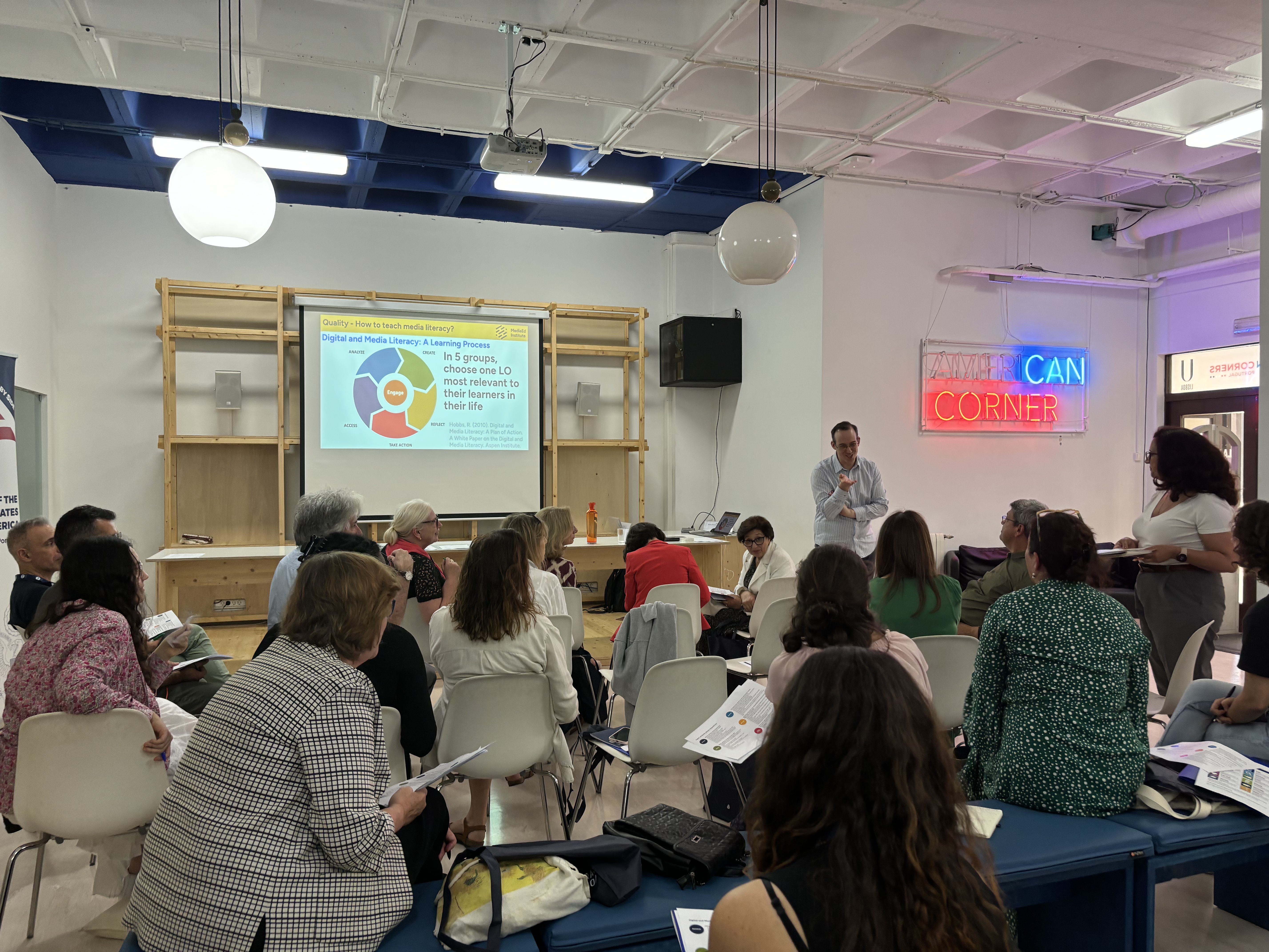 You can see that I am thinking a lot about the proper training of teachers in media literacy. What does proper mean? In my opinion and experience, it means much more than providing theory, case studies, and lecturing on the topic. Teachers need to experience new instructional strategies as learners themselves in order to build their confidence in feeling competent to transfer these practices into their own settings. This is the exact approach we brought to University of Lisbon as part of our ongoing MediaEd Institute – a leadership development in media literacy education.Â