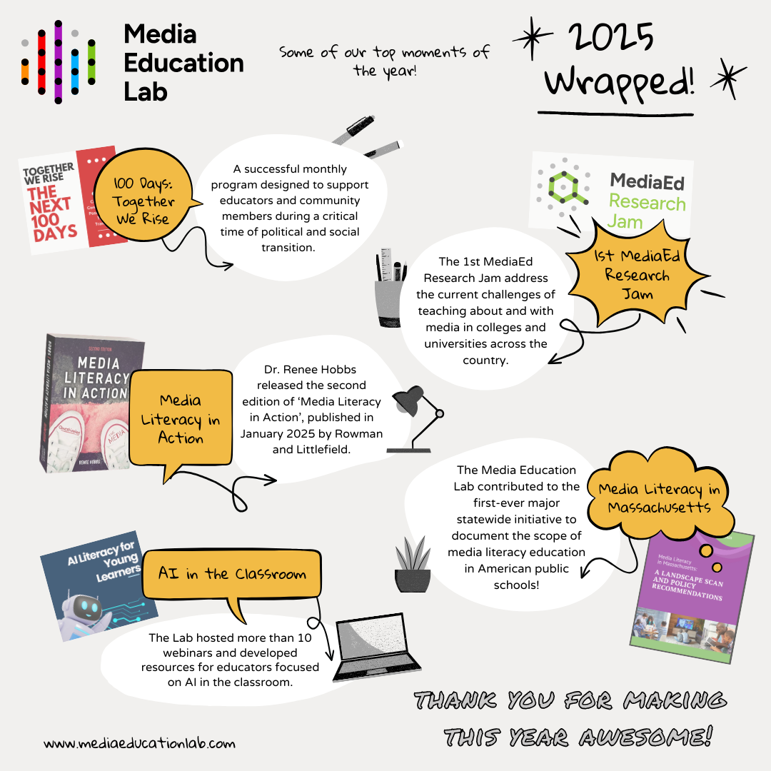 Over more than 20 years, the Media Education Lab has helped to bring together practitioners and scholars to advance the practice of media literacy education locally and globally. Under the leadership of Renee Hobbs, the organization has reached hundreds of thousands of educators, students, and community leaders. Here is a brief history of our impactful work