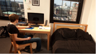 All units have an open living space and a private bathroom. The mini-loft features a snack area with a small fridge and space for a microwave, a bed, dresser, and table and chair. The studio loft features more space, adds a two-burner cooktop to the kitchen, and has either a double or twin bed. The double loft is suitable for two to share and adds a full kitchen with dishwasher, a furnished dining area and lounge area and double bed (or two twins). Also, some of the double lofts can be combined with an adjacent mini-loft. Finally the two-bedroom loft is comprised of 2 single bedrooms sharing a kitchen, dining area and bathroom.