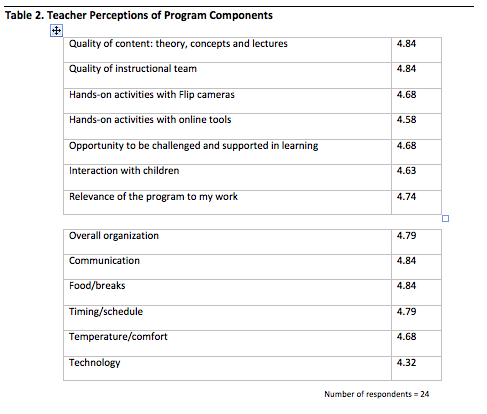 The lowest score—for technology—reflects the challenges we experienced in using wireless access available at the Russell Byers Charter School. When 24 teachers attempted to use the Internet through the wireless for a production activity, the service was often slow and unresponsive. For the 2010 program, we have dramatically upgraded the wireless capacity available to participants.