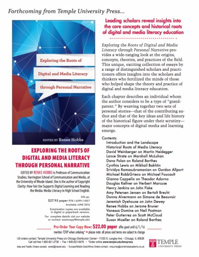 Now a new book aims to address this challenge by exploring the metaphorical "grandparents" whose theories and ideas have shaped the present generation of thought leaders in the field. Designed to introduce undergraduates and graduate students to key theorists, Exploring the Roots of Digital and Media Literacy though Personal Narrative (Temple University Press, 2016) includes essays from Henry Jenkins, Douglas Kellner, David Weinberger, Donna Alvermann, Lance Strate, Gianna Cappello, Susan Moeller, Dana Polan and many others. By weaving together two sets of personal stories -- that of the contributing author and that of the key ideas and life history of the historical figure under scrutiny -- major concepts of digital media and learning emerge.Â
