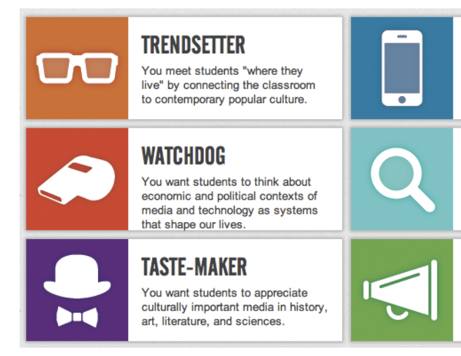 At this website, you can take the quiz and receive a customized profile that invites you to reflect on your values and motivations for bringing media and digital literacy to learners. You can create a Group and invite people to complete the quiz and use the data to create reflection on the benefits of having teaching staff with different motivations for digital and media literacy.